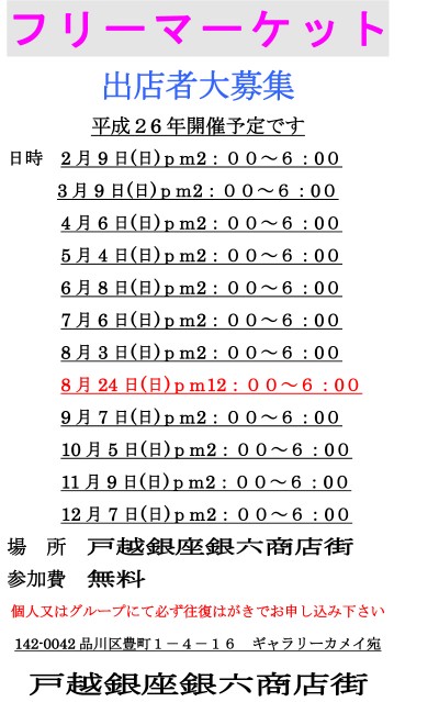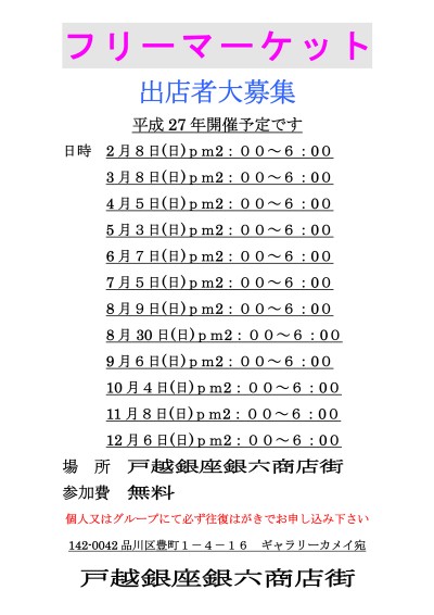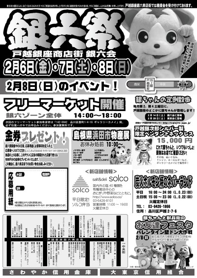 2月6日(金)・7日(土)・8日(日)は銀六祭開催! ★8日(日)のイベント ・フリーマーケット(銀六会ゾーン) 他にも物産展や銀ちゃんとのふれあいなどがあります。 ぜひこの機会に戸越銀座へお越し下さい。