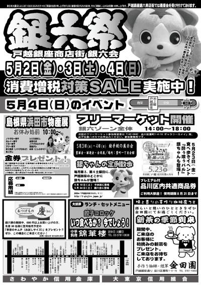5月1日(金)・2日(土)・3日(日)は銀六祭開催! ★3日(日)のイベント ・フリーマーケット(銀六会ゾーン) 他にも物産展や銀ちゃんとのふれあいなどがあります。 ぜひこの機会に戸越銀座へお越し下さい。