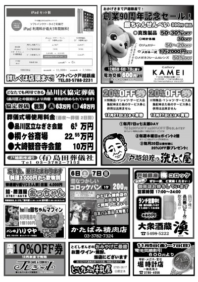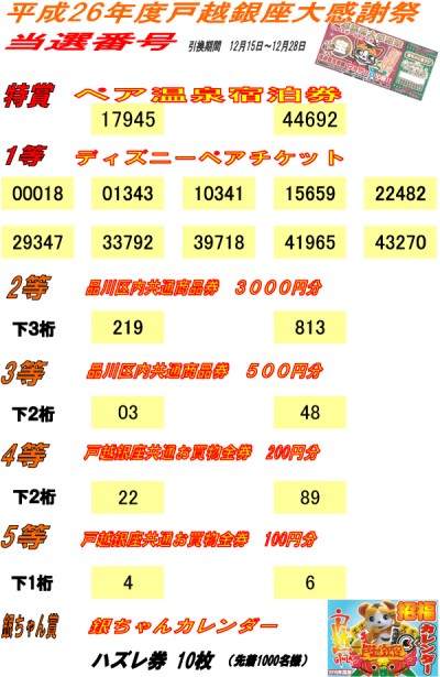 謹んで新年のご挨拶を申し上げます。 今年も戸越銀座商店街をご愛顧くださいますよう、よろしくお願い申し上げます。 2015年1月1日 戸越銀座商栄会商店街振興組合 理事長 山村俊雄 戸越銀座商店街振興組合 理事長 梅原壮一 戸越銀座銀六商店街振興組合 理事長 亀井哲郎