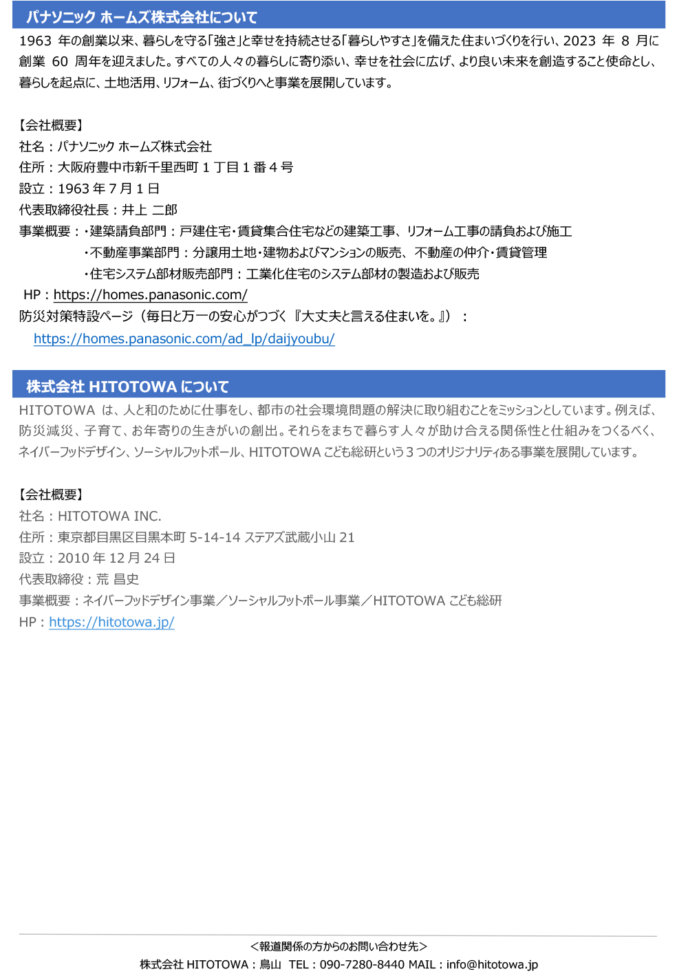 今回の受賞は、街の防災力向上を目指し、地域に密着した活動が評価され、3者(戸越銀座商店街連合会、パナソニック ホームズ株式会社、株式会社HITOTOWA)ともに、初めての受賞となります。