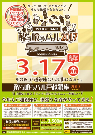 2017 March 17 (Friday) 17: 00 ~ It will be held the "Yoiu喰U Bal 2017 Togoshiginza". Sales of the deals advance ticket is from February 20 (Monday). Because it is a limited quantity, please purchase as soon as possible.