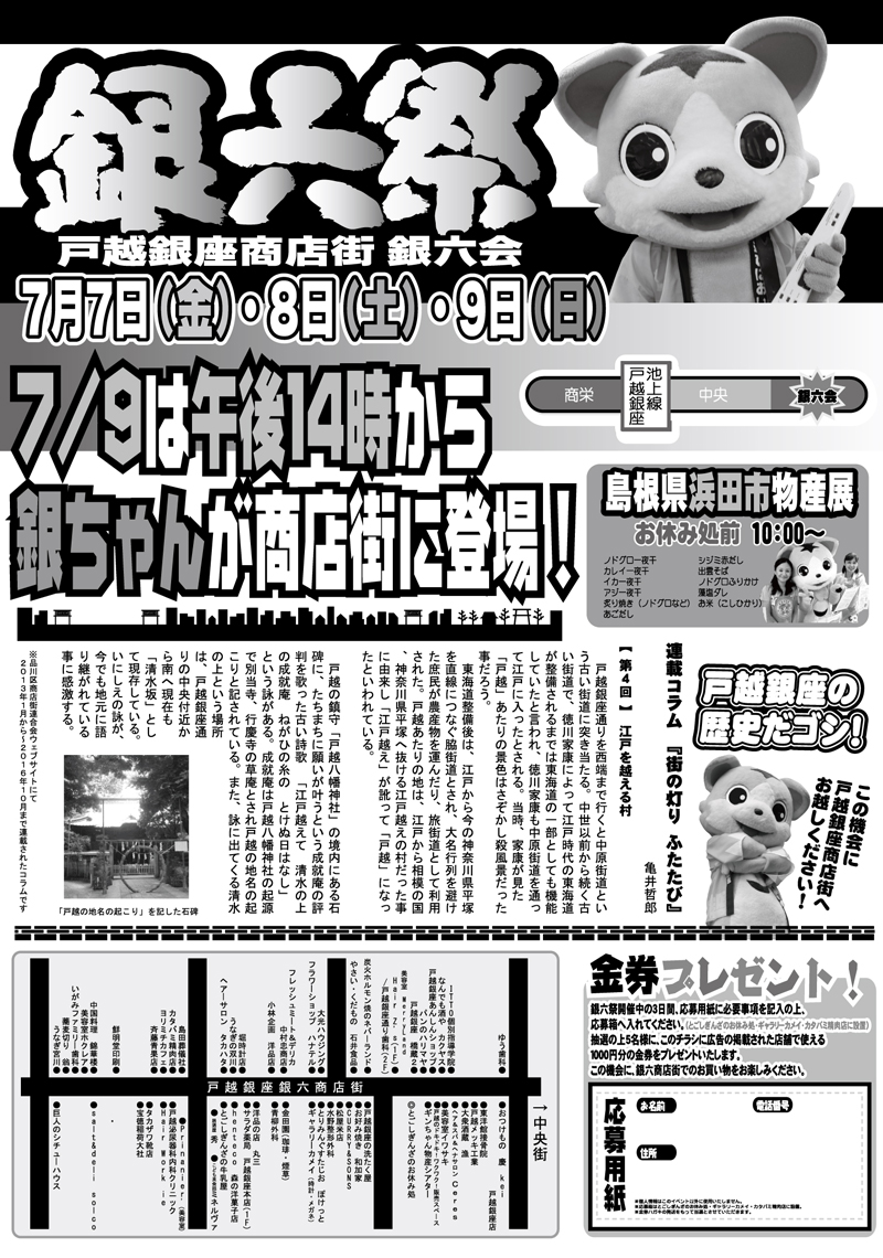July 7 (Friday), 8 (Saturday), 9 (Sunday) is "silver six Festival" held! 9 days from 14:00 "silver-chan" will come to play. By all means, please come to Togoshiginza shopping street in this opportunity!