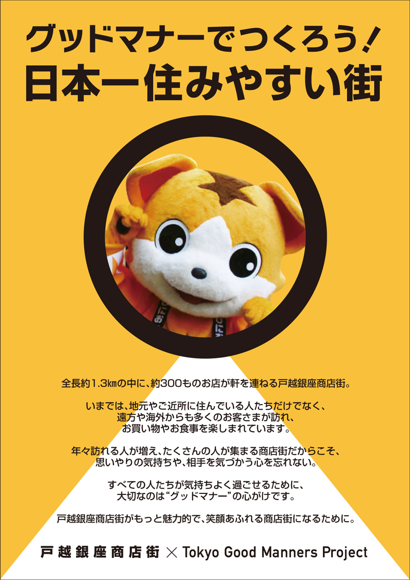 In Togoshiginza shopping street Federation, it sets a "Let's Make in Good manners! Japan livable city" in the slogan, we will implement the initiatives on a variety of manners improved in the future. Because everyone will continue to strive to spend in a pleasant shopping street, thank you a Togoshiginza shopping district in the future.