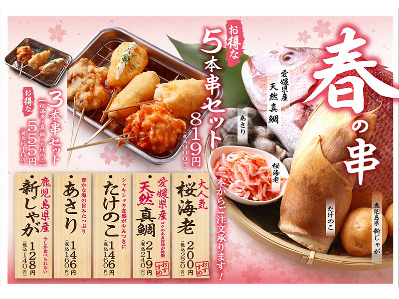 - We offer grilled offal made with fresh pork offal delivered directly from Shibaura, and authentic kushikatsu skewers fried in specially selected lard.